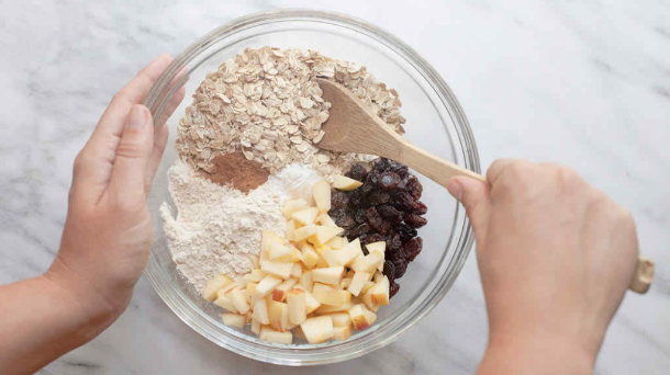 2. In a vast blending dish, mix together the oats, flour, cinnamon, pop, salt, apple, and raisins until all around joined. Put aside.